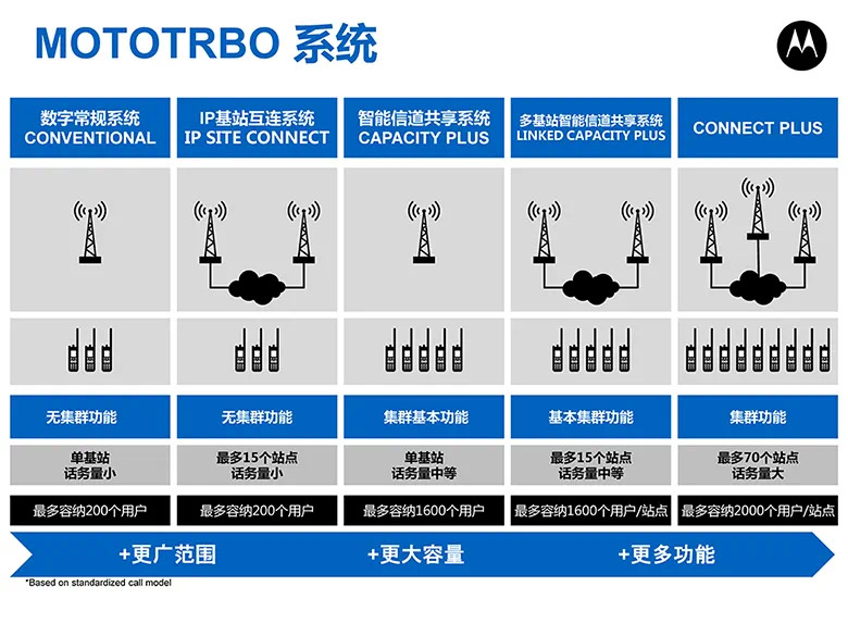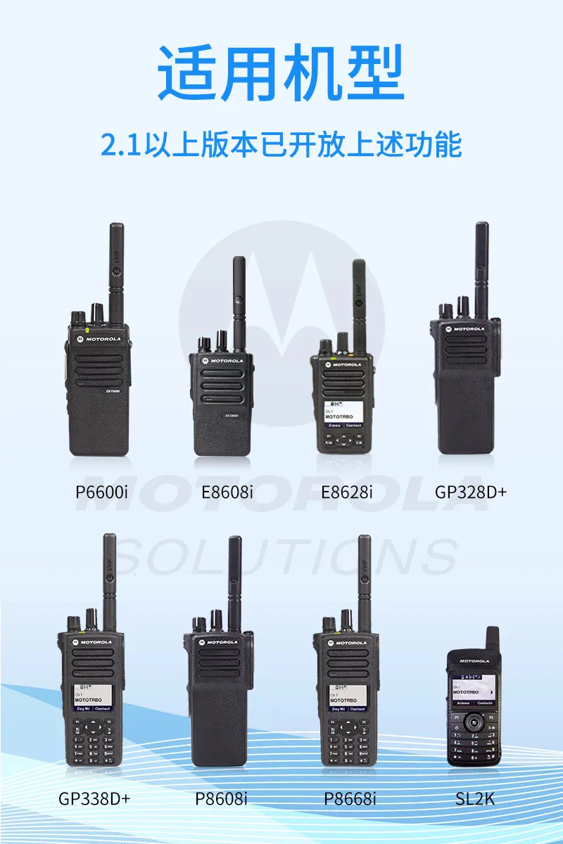 2.1以上版本的對(duì)講機(jī),已經(jīng)被授權(quán)可使用摩托羅拉的集群系統(tǒng)(Capacity Plus-Single site和Capacity Plus-Multi-site)。摩托羅拉公司推出的集群系統(tǒng)擁有運(yùn)行穩(wěn)定、自帶故障弱化,無專用控制信道(所有信道皆可用于語音業(yè)務(wù),提高系統(tǒng)整體性價(jià)比),解決了傳統(tǒng)對(duì)講系統(tǒng)的地域限制和容量限制問題。接入集群系統(tǒng)后對(duì)講機(jī),將會(huì)擁有更多更強(qiáng)大的系統(tǒng)功能,更全面的幫您解決工作中遇到的問題。