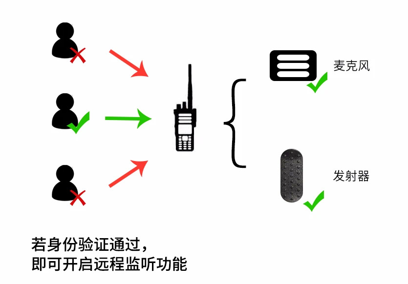 需要身份驗(yàn)證的對(duì)講機(jī)遠(yuǎn)程監(jiān)聽功能,允許用戶通過菜單向目標(biāo)對(duì)講機(jī)發(fā)起遠(yuǎn)程監(jiān)聽請(qǐng)求。請(qǐng)求成功后,目標(biāo)對(duì)講機(jī)的麥克風(fēng)和發(fā)射器將被激活,以便遠(yuǎn)程監(jiān)聽。