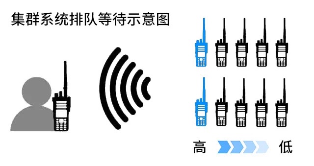 集群系統(tǒng)中當(dāng)用戶在排隊(duì)等待語音信道時(shí),高優(yōu)先級(jí)用戶排在前面,低優(yōu)先級(jí)排在后面。這有助于實(shí)現(xiàn)重要通話和緊急通話的優(yōu)先傳送。