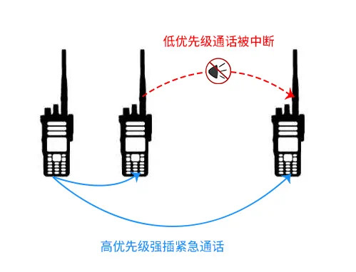 常規(guī)系統(tǒng)和集群系統(tǒng)均允許高等級(jí)權(quán)限用戶優(yōu)先進(jìn)行呼叫。高等級(jí)用戶可以通過強(qiáng)插功能,中斷低優(yōu)先級(jí)用戶的呼叫。