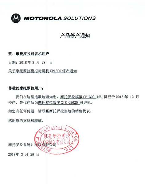 摩托羅拉系統(tǒng)根據(jù)國(guó)家相關(guān)要求,已于2015年逐步停止了模擬機(jī)全球工廠的生產(chǎn),同時(shí)按照國(guó)家有關(guān)規(guī)定,相關(guān)機(jī)型的《無線電發(fā)射設(shè)備型號(hào)核準(zhǔn)證》及《防爆電氣設(shè)備防爆合格證》均已不再辦理延期手續(xù)。