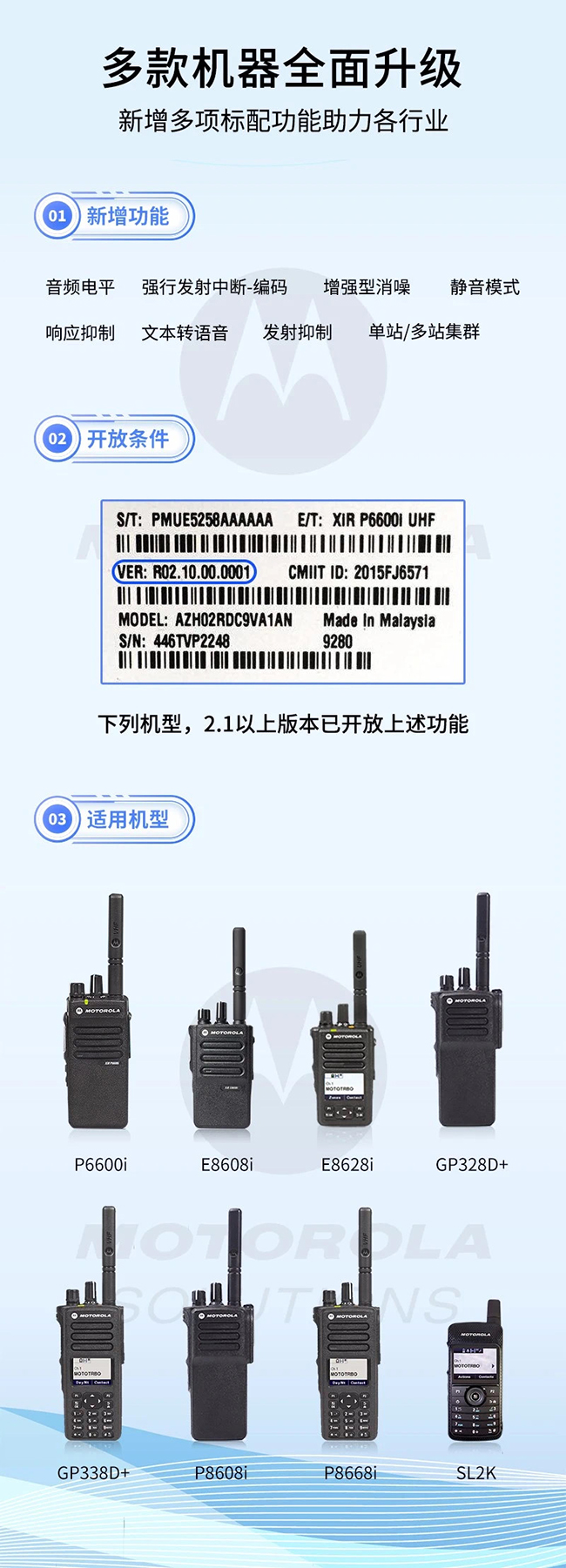 從2019年第四季度開始,我司經(jīng)銷的多款摩托羅拉對講機新版機器在出廠時,有些功能已經(jīng)免費開通供客戶使用了,其中包括:音頻電平、強行發(fā)射中斷-編碼、增強型消噪、靜音模式、文本轉(zhuǎn)語音、發(fā)射抑制、響應抑制和單站/多站集群。